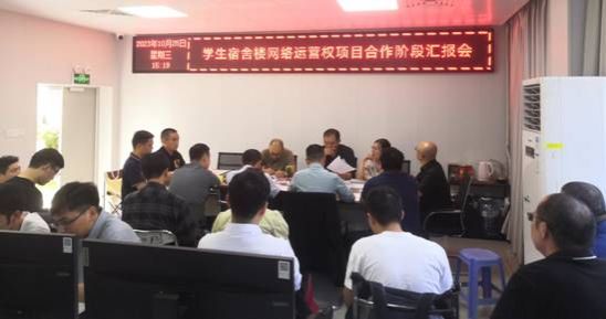 2023年10月25日下午,信息技术中心方德坚主任主持召开学生宿舍网络运营权项目合作阶段汇报会,浙江盛洋科技股份有限公司及其合作单位等一行16人,信息技术中心人员参与会议。