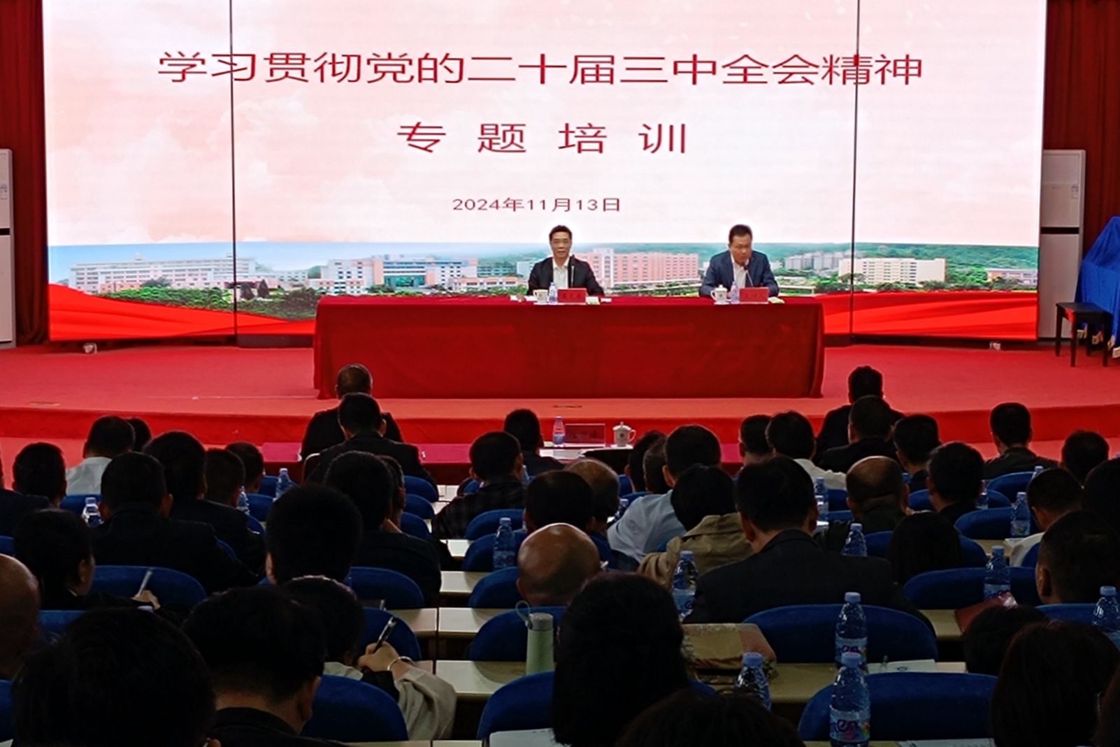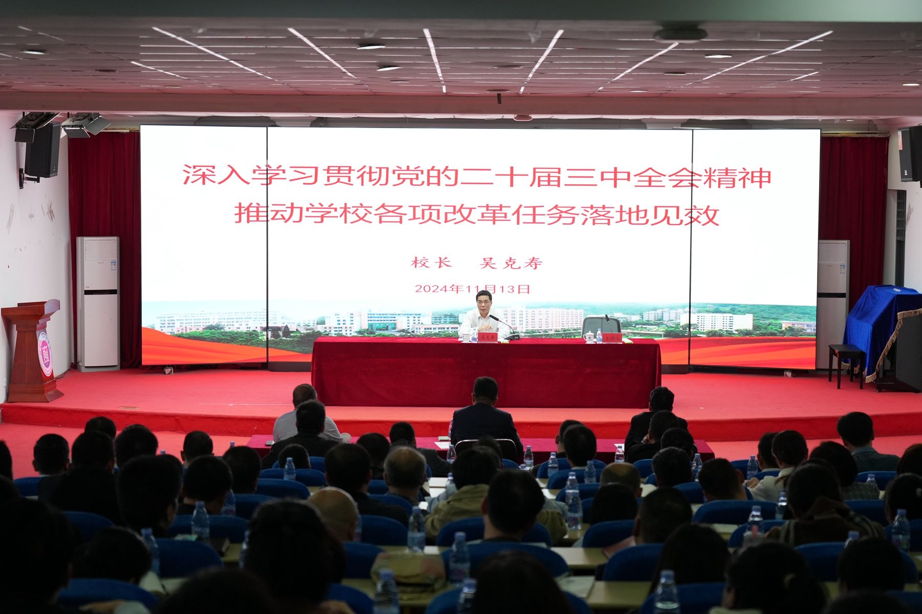 11月13日下午,我校在五马山校区科学楼金泰学术报告厅开展学习贯彻党的二十届三中全会精神专题培训。校党委副书记、校长吴克寿作了题为《深入学习贯彻党的二十届三中全会精神 推动学校各项改革任务落地见效》的辅导报告。报告会由校党委副书记林海峰主持。