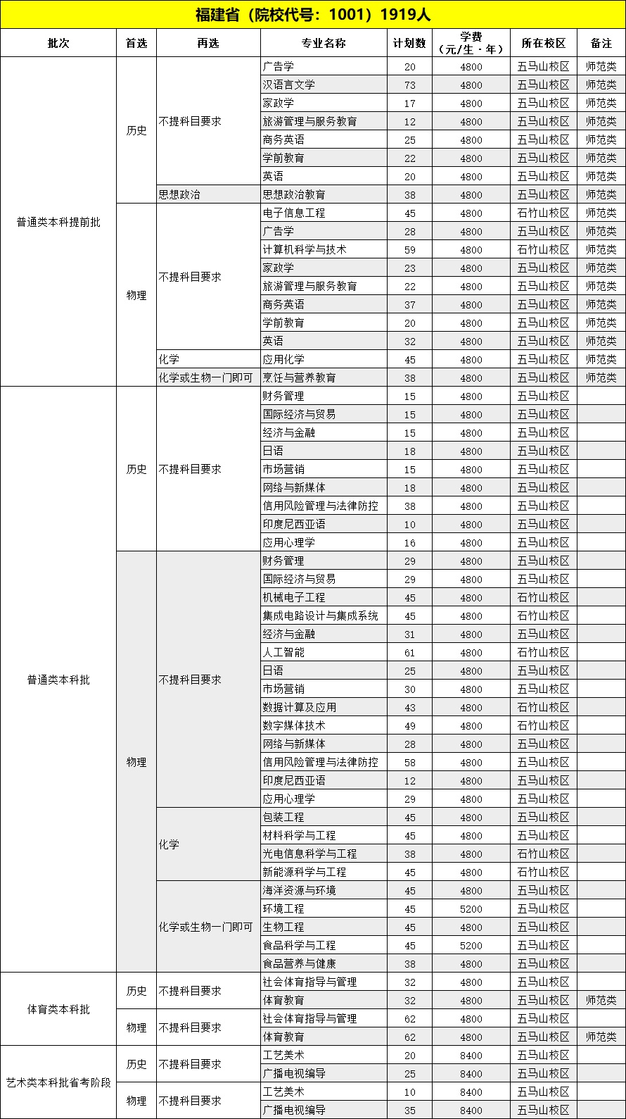 经省教育厅核准,我校2023年普通本科招生专业39个,普通本科招生计划总数为2479人。其中,福建生源1919人、省外生源560人;师范类874人(福建省提前批576人、体育类本科批94人,省外本科批204人)。